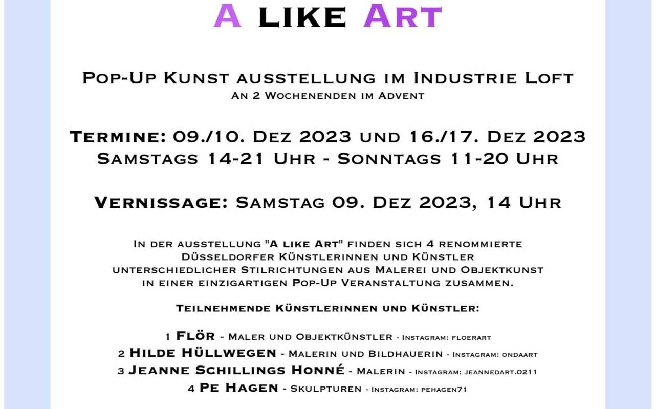 An zwei Wochenenden im Dezember findet in einer alten Fabrik auf der Rethelstrasse 33 im Hof eine Kunstausstellung statt. Vier tolle, bekannte Düsseldorfer Künstler aus Malerei und Skulptur nehmen teil und werden anwesend sein.