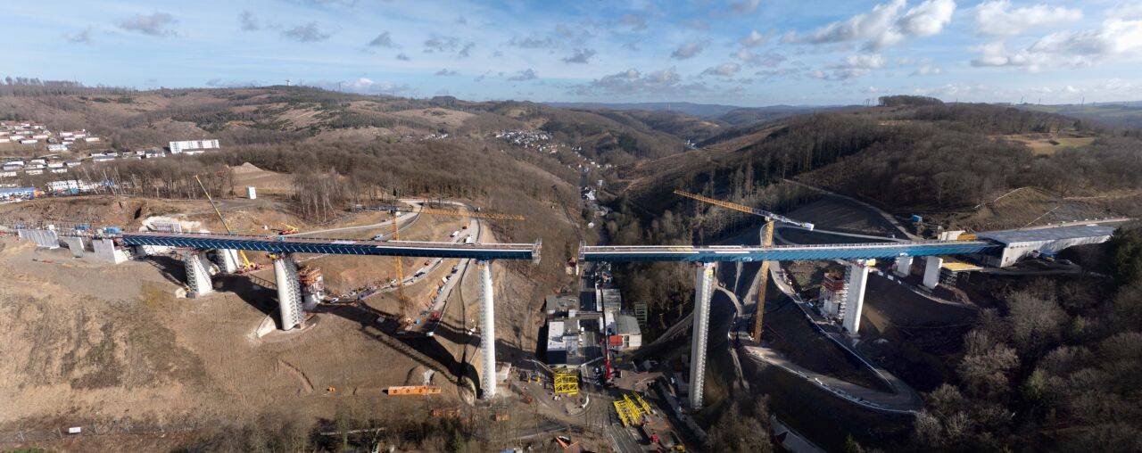 Wissing war ins Sauerland gekommen, um sich ein Bild vom Baustellenfortschritt zu machen: Seit mehreren Monaten wird der stählerne Überbau von beiden Seiten des Tales Stück für Stück über die Pfeiler geschoben. Nun sind beide Teile nur noch wenige Meter voneinander entfernt und sollen zeitnah miteinander verbunden werden, wie es am Dienstag von der Autobahn GmbH hieß. Der Brückenbauer spricht in so einem Fall von der "Stahlhochzeit".