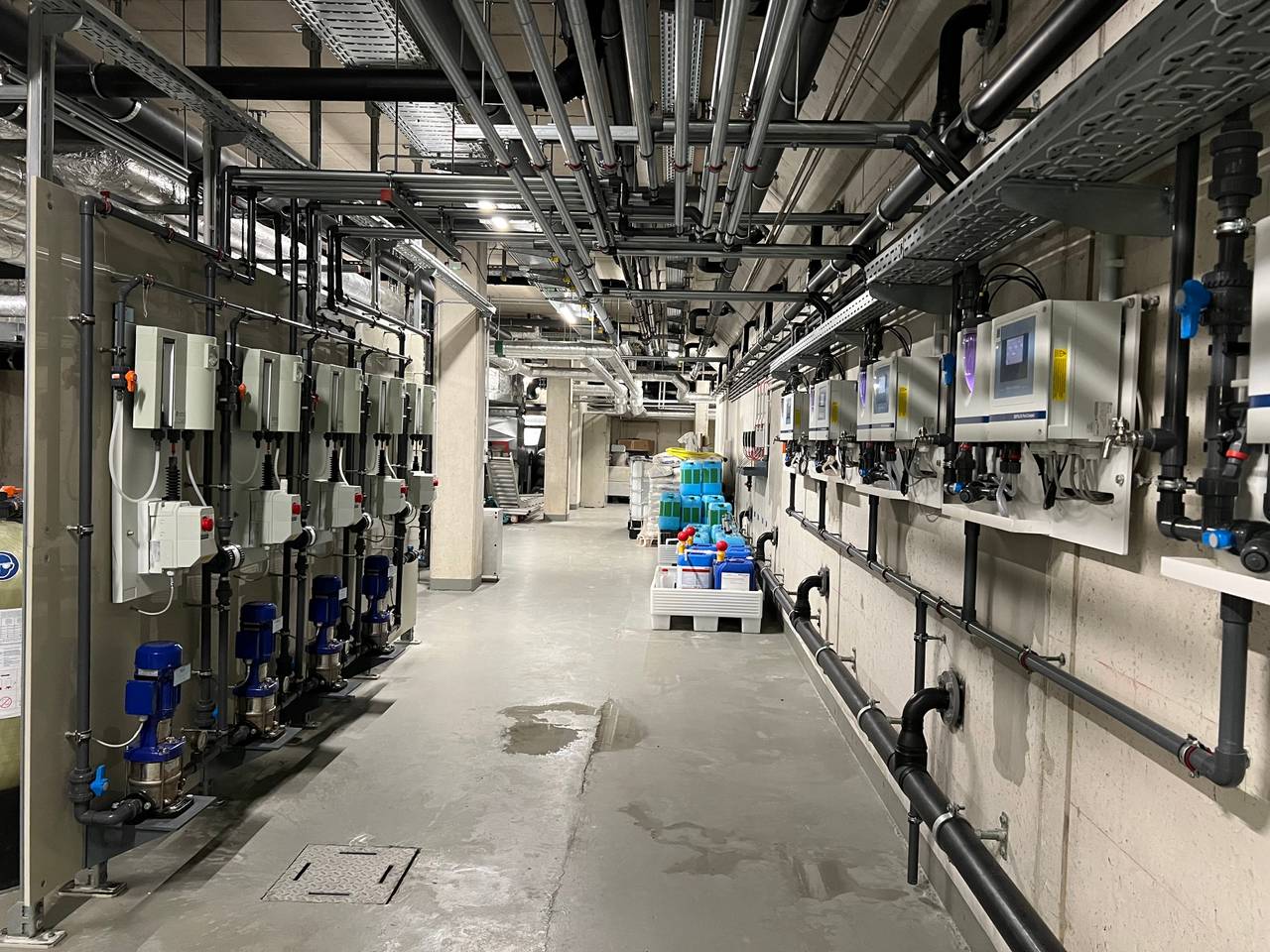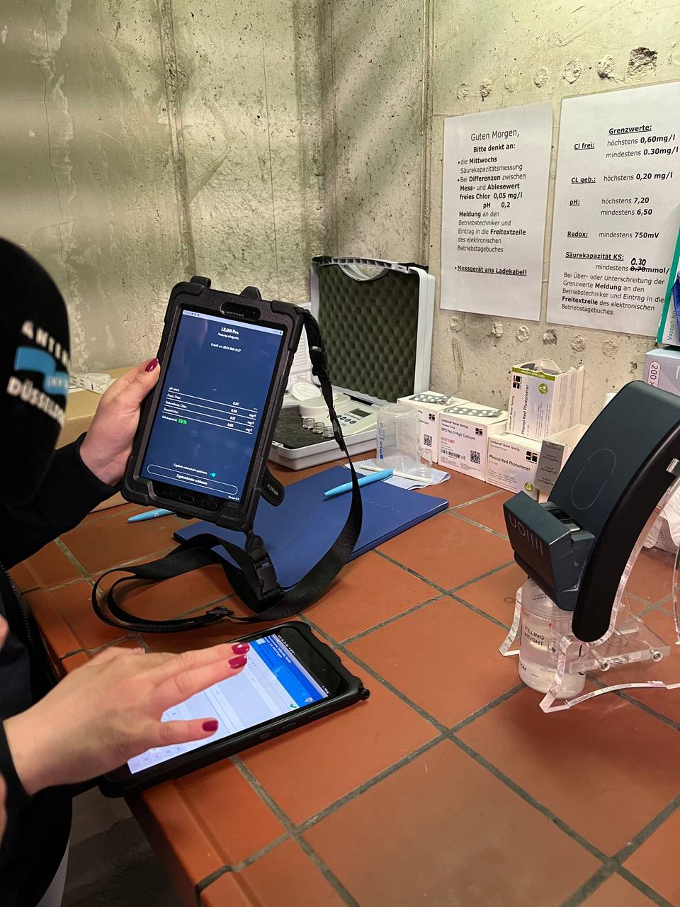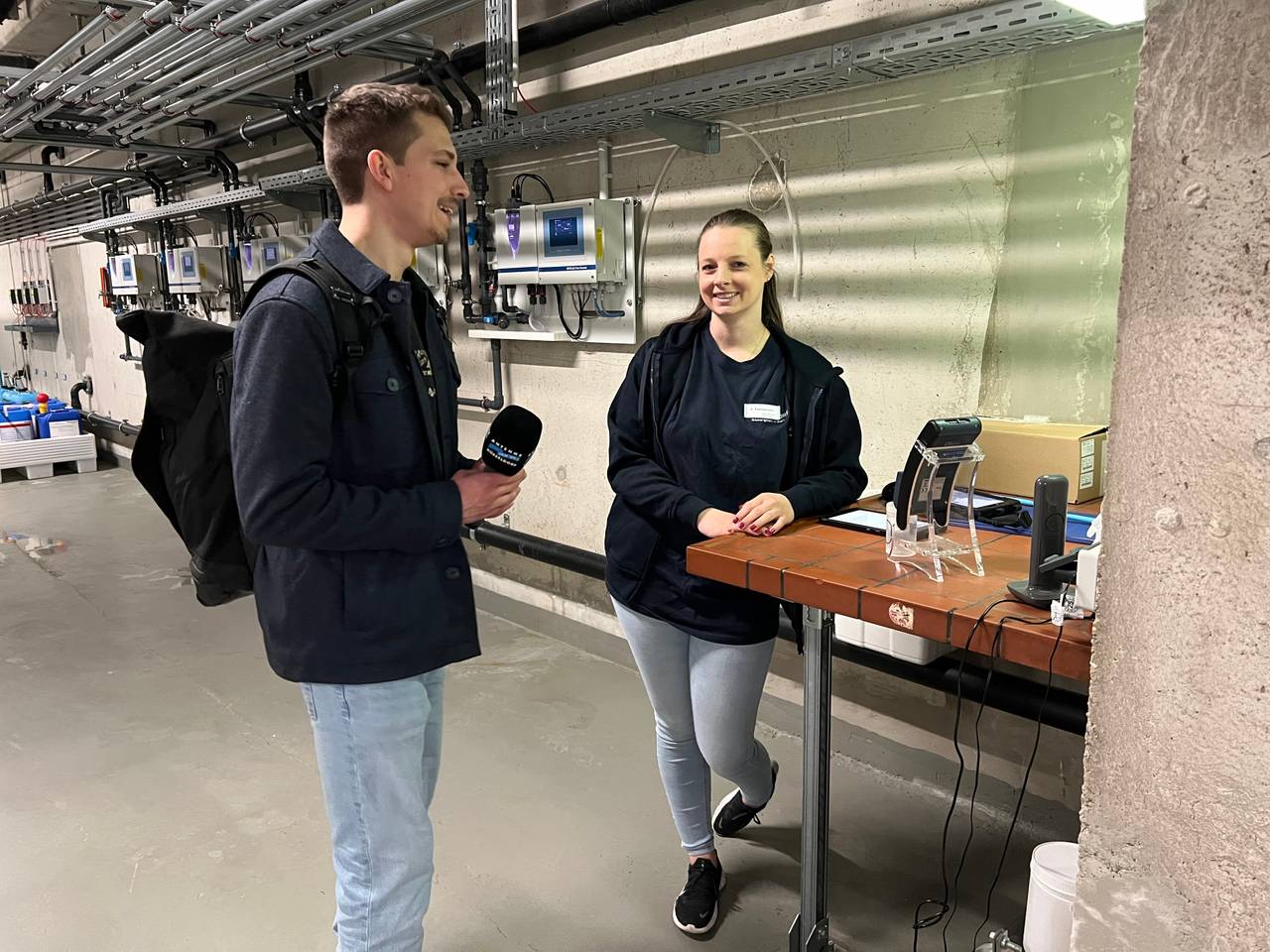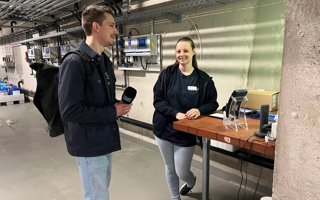 Für die zweite Station ging es in den Technikraum des Allwetterbades. Dort konnte Christopher einen Blick hinter die Kulissen werfen. Im Anschluss hat er zusammen mit Mitarbeiterin Sandra eine Wasserprobe entnommen und unter anderem den Chlorgehalt des Wassers bestimmt.