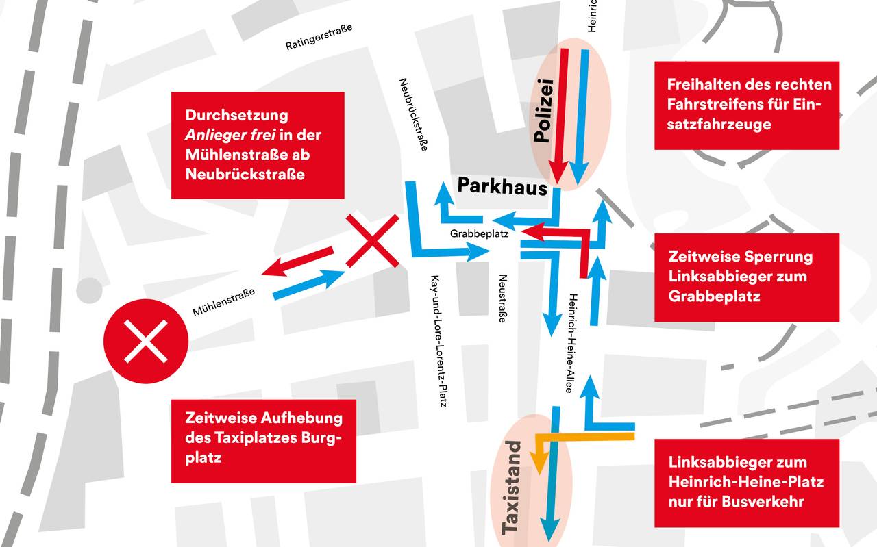 Die neuen Verkehrsmaßnahmen von Stadt und Polizei rund um die Heinrich-Heine-Allee am Wochenende waren offenbar erfolgreich. Einsatzfahrten im Bereich der Altstadt seien dadurch wieder ungehindert möglich gewesen, hieß es von Seiten der Stadt. Auch die Polizei zog ein positives Fazit.