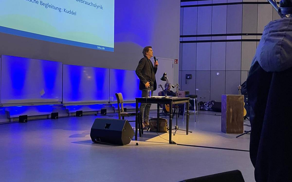Unterstützt wird Campino dabei heute von Philipp Oehmke, dem Kulturchef vom Spiegel und seinem Bandkollegen Kuddel. Bei der ersten Vorlesung als Gastprofessor vor drei Wochen hatte Campino über, die Lyrik gesprochen, die ihn begleitet und inspiriert hat. Weil der Andrang auf die Plätze im Hörsaal so groß war, wurden die die Studierenden und Beschäftigten der Uni per Losverfahren ausgewählt.