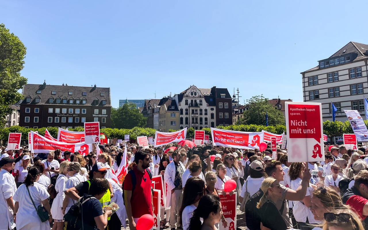 Hier in Düsseldorf hat am Mittag auf dem Burgplatz eine Demonstration von tausenden Apothekerinnen und Apothekern stattgefunden. Sie wollten damit auf die vielen Probleme in den Apotheken aufmerksam machen. Neben den Lieferschwierigkeiten und dem Personalmangel klagen sie auch über zu wenig Geld.