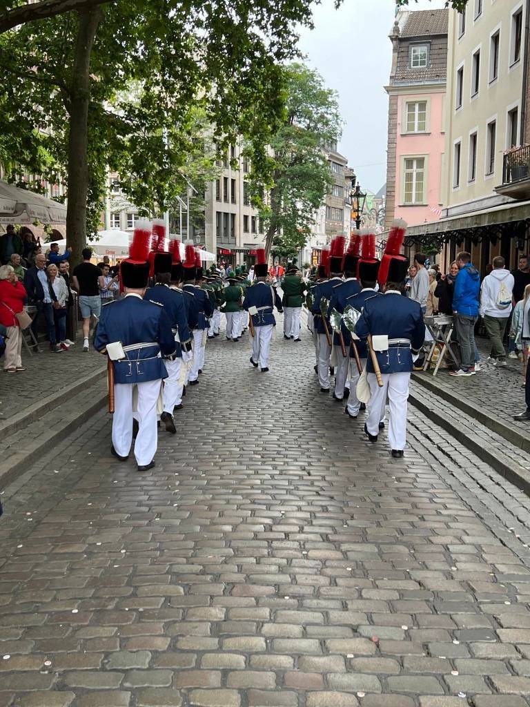 18.15 Uhr: Weitermarsch des Regiments in der Jägerhofstraße / Zugweg: Maximilian-Weyhe-Allee, Ratinger Tor, Hofgartenrampe, Oberkasseler Brücke, Kaiser-Friedrich-Ring, Kaiser-Wilhelm-Ring, Festplatz