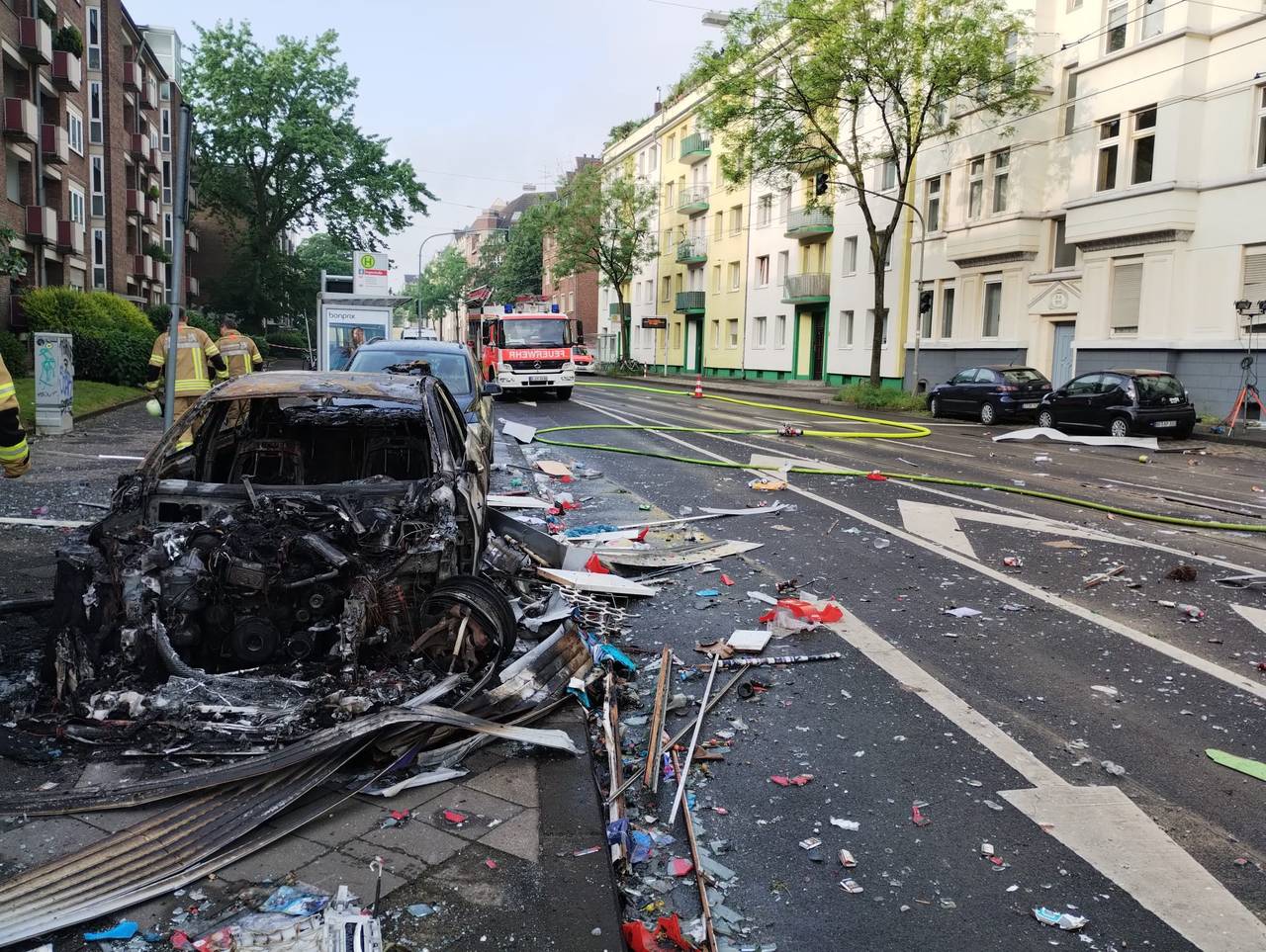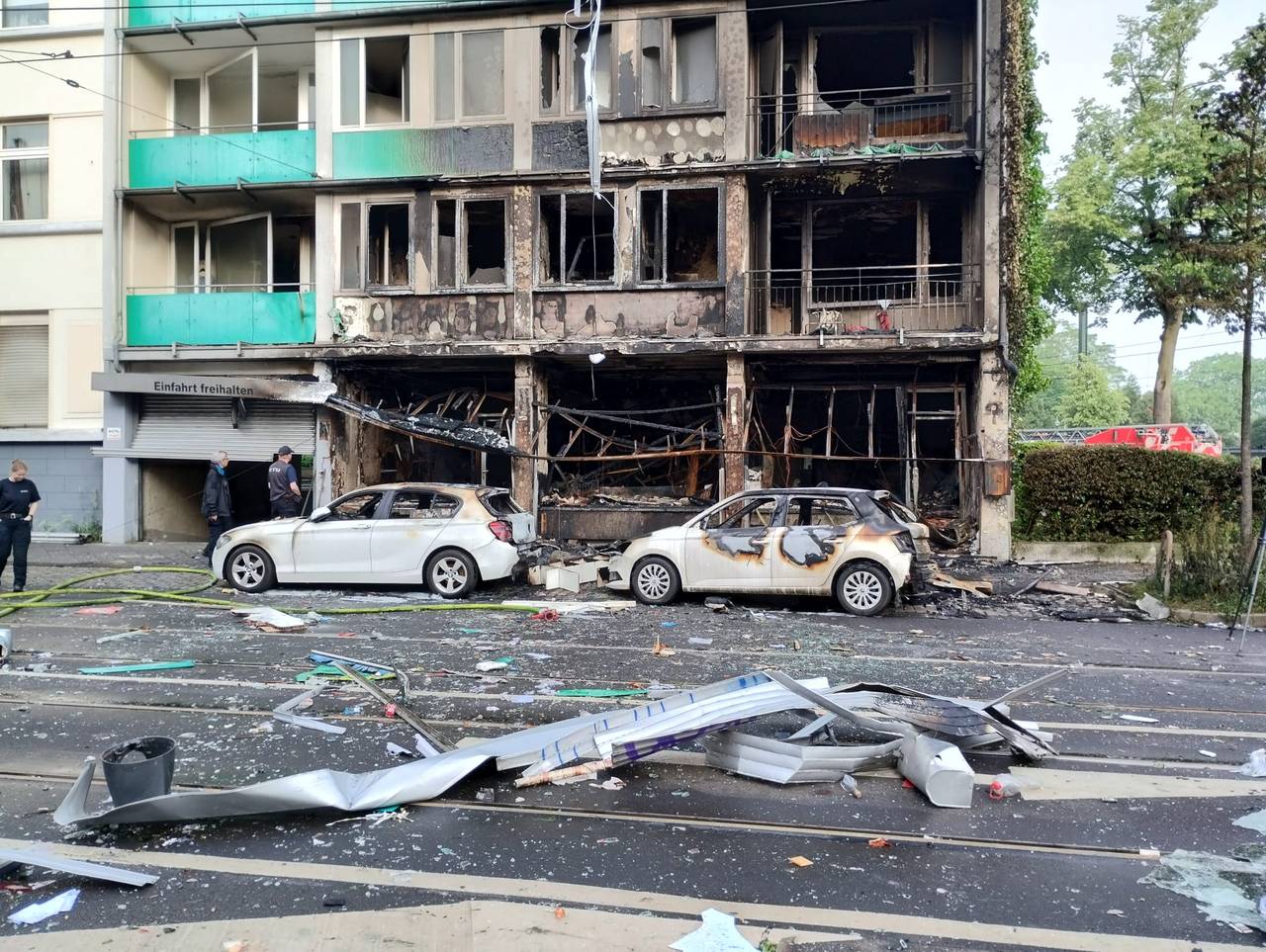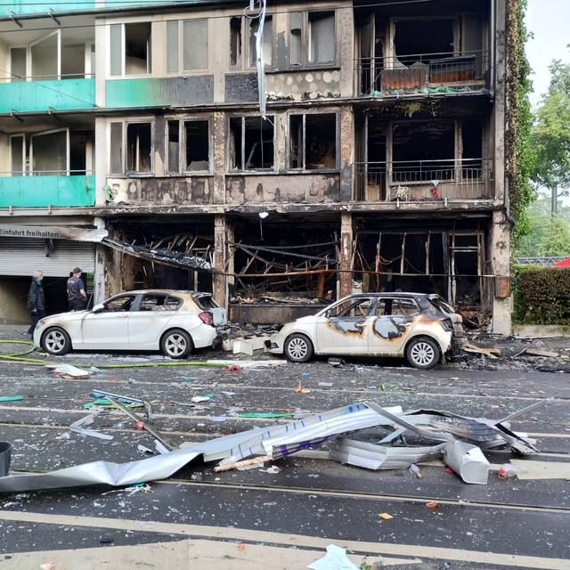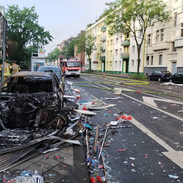 Auch auf der Straße vor dem Gebäude gibt es erhebliche Schäden durch die Trümmer, hier sind auch PKW in Flammen aufgegangen. Mehrere Personen mussten per Drehleiter und von Einsatztrupps der Feuerwehr aus dem Gebäude gerettet werden. In umliegenden Gebäuden mussten 70 Personen kurzfristig betreut werden. Sie konnten mittlerweile aber wieder in ihre Wohnungen zurück. Das betroffene Gebäude ist aktuell unbewohnbar. Der Feuerwehreinsatz wird noch stundenlang dauern. Zur Brandursache gibt es noch keine gesicherten Informationen. Menschen hätten sich zu diesem Zeitpunkt nicht in dem Ladenlokal aufgehalten, so der Feuerwehrsprecher.