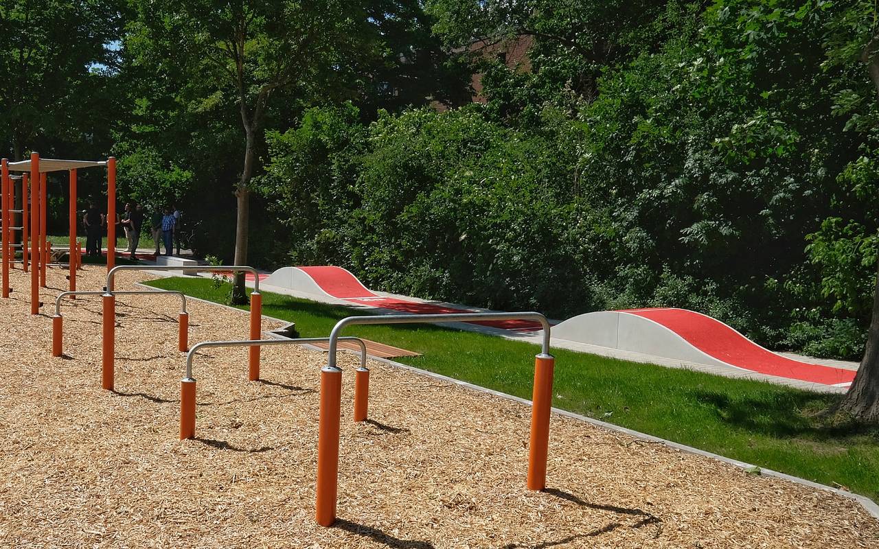Zu den Highlights gehört eine Calisthenics-Anlage, an der man mit dem eigenen Körpergewicht trainieren kann. Ähnliche Anlagen gibt es im Flora- und Zoopark und im Volksgarten. Dazu ist ein neues Mini-Fußballfeld mit kleiner Tribüne eingerichtet worden, auf der man auch trainieren kann. Außerdem gibt es neue Tischtennis-Platten, eine neue Lauf- und Sprintstrecke und eine Weitsprung-Markierung. Kosten des Umbaus: 350.000 Euro.