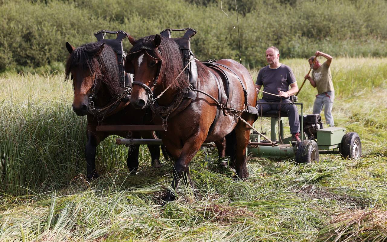 Im Eller Forst helfen aktuell Pferde bei der Pflege der Wiese. Zwei französische Kaltblüter ziehen dabei ein Mähwerk über die Feuchtwiese an der Rothenbergstraße. Das ist nördlich vom Unterbacher See. Das gemähte Gras soll jetzt trocknen und anschließend - wieder von den Pferden - weggebracht werden.