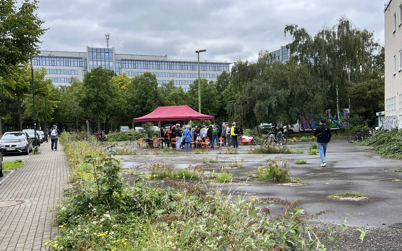Auf dem ehemaligen Parkplatz zwischen Gesundheitsamt und U-Bahnhof Handelszentrum an der Kölner Straße gab es heute Mittag (30. August 2023 // 12:30 Uhr) wieder eine Aktion von fiftyfifty.