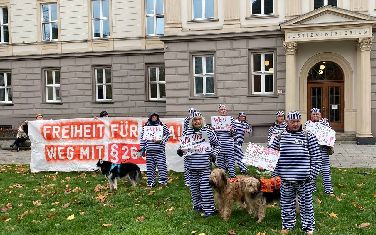Etwa 25 fiftyfifty-Verkäufer*innen demonstrierten in Häftlingsuniformen für die Freilassung von Gisa - viele von ihnen saßen bereits selbst wegen Schwarzfahrens im Gefängnis. Diese Menschen seien arm, nicht kriminell - sagt Sozialarbeiter Johannes Dörrenbächer von fiftyfifty. Daher ist seine Forderung: