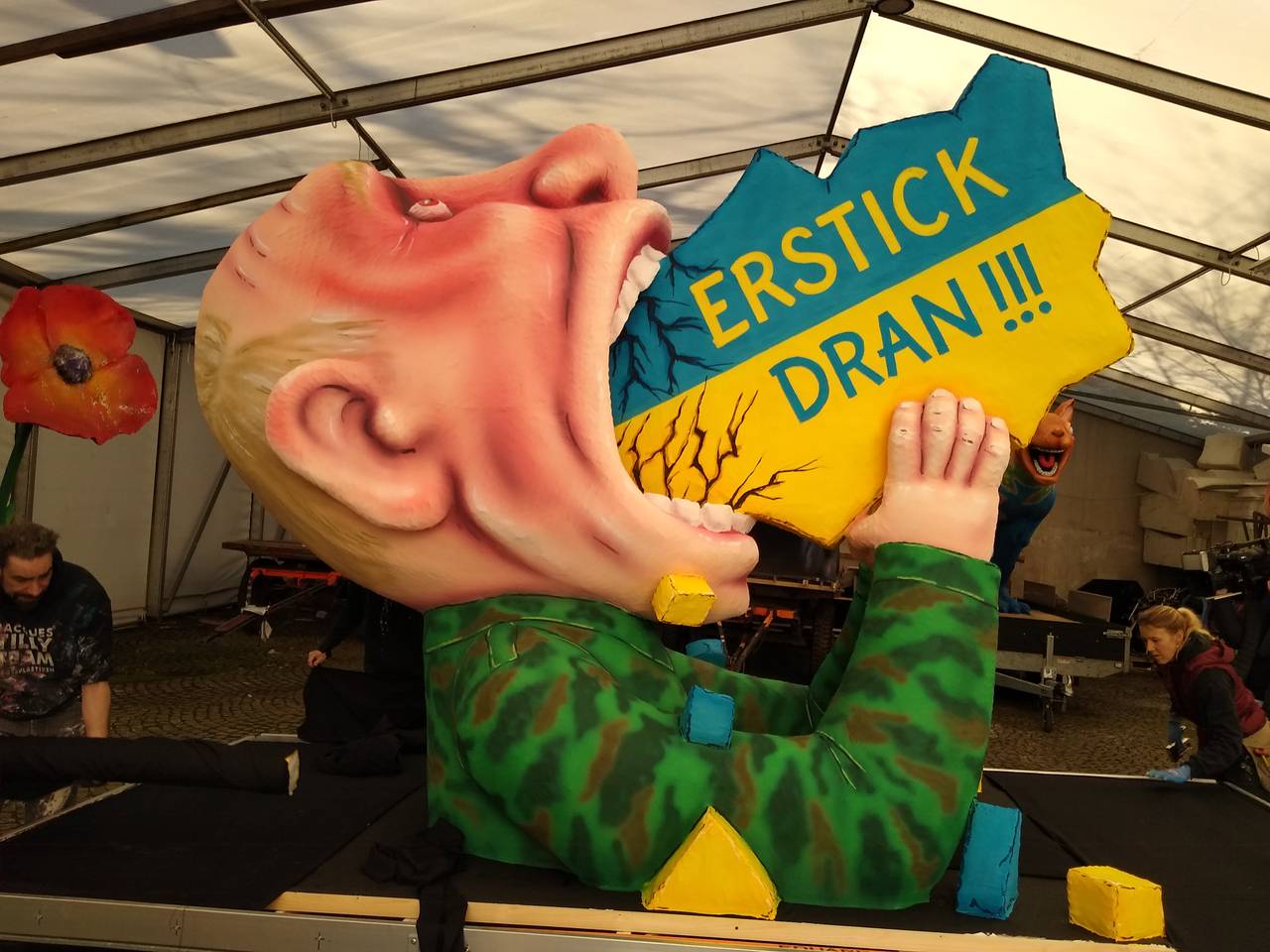 Er hat eine deutliche Botschaft in Richtung Russland und Wladimir Putin. Er zeigt Putin, wie er versucht die Ukraine zu verschlingen - mit dem Satz "Erstick Dran". Diesen Wagen hat Tilly in Eigenregie unabhängig vom Comitee Düsseldorfer Carneval gebaut. Antenne Düsseldorf Reporter Joachim Bonn hat in der Wagenbauhalle in Bilk mit Wagenbauer Jacques Tilly gesprochen.Auch darüber, warum der Wagen entstanden ist.