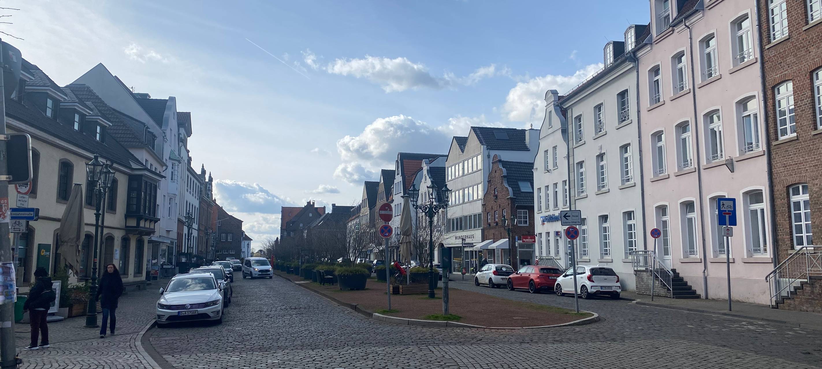 Neben der St. Suitbertus Basilika befindet sich der Stiftsplatz, mit dem historischen Kopfsteinpflaster und alten Häuserfassaden.