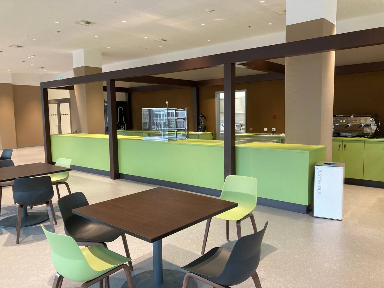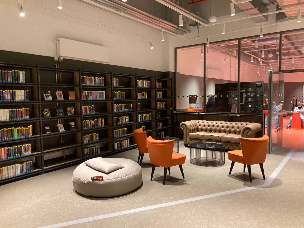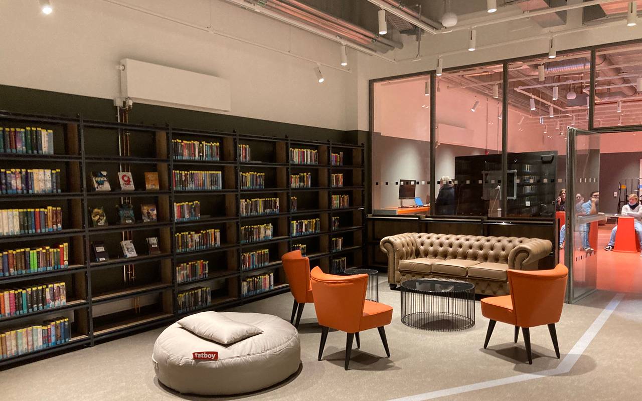 Die Bücherregale sind maximal 1,50 m hoch, sodass man die gesamten Räume überblicken kann, man kann abgeschlossene Büroräume mieten, 60 offene Arbeitsplätze und schnelles Internet nutzen. Ein weiterer Schwerpunkt sei Nachhaltigkeit, so Kamp.