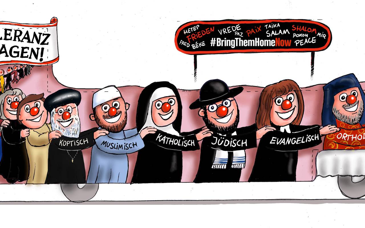 Auf dem Wagen wird eine Polonaise von Menschen unterschiedlichen Glaubensrichtungen zu sehen sein, außerdem der Schriftzug #BringThemHomeNow und das Wort Frieden in verschiedenen Sprachen.
