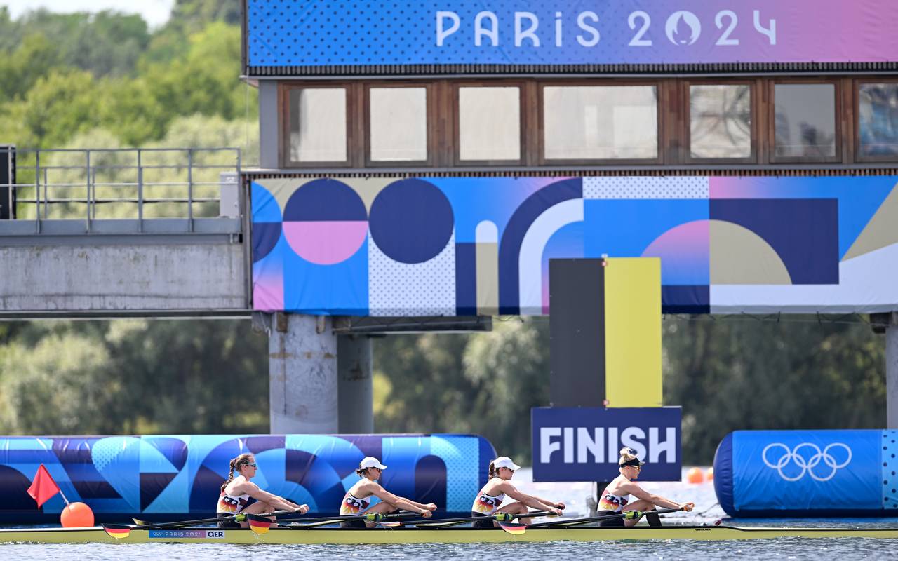 Ruderin Leonie Menzel (2. v.r.) und Doppelvierer bei Olympia in Paris