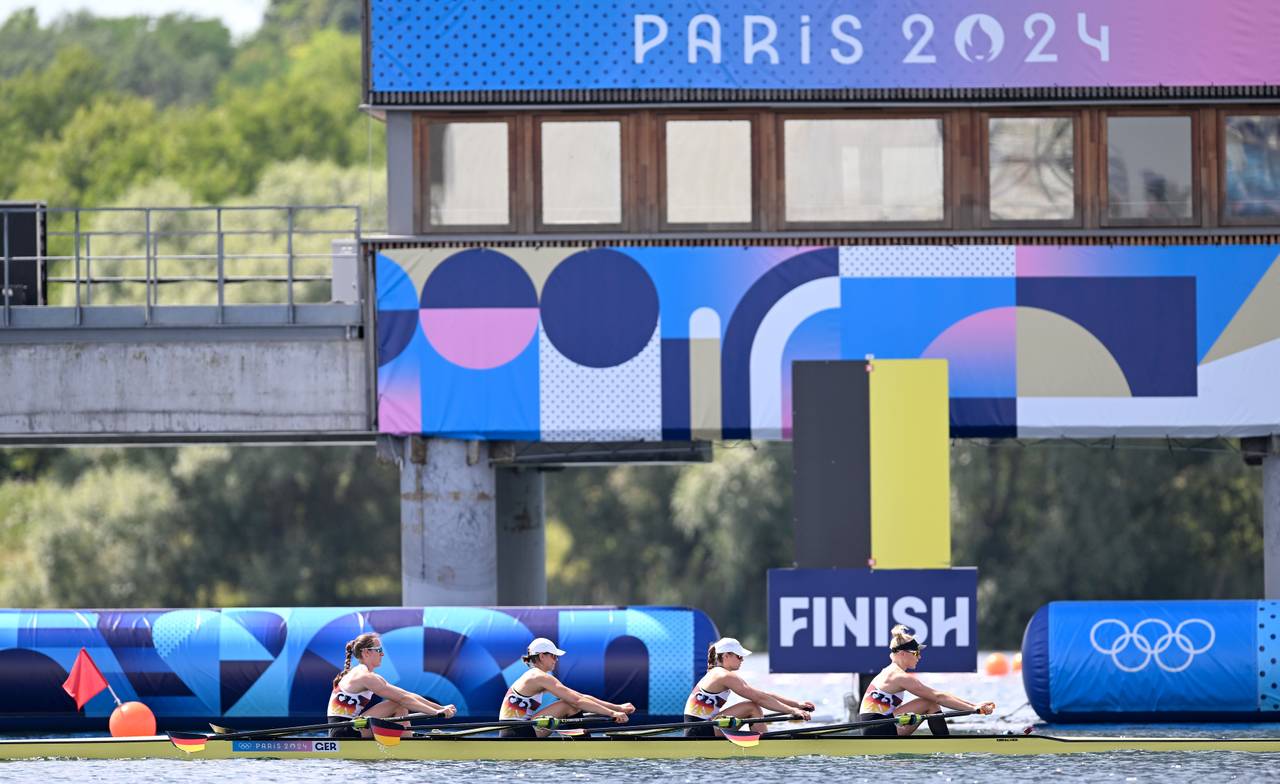 Nach der Hälfte der Strecke lagen die deutschen Ruderinnen noch deutlich hinter den Medaillenrängen. Das deutsche Boot um Leonie Menzel kämpfte sich aber zurück und sicherte sich auf den letzten Metern den dritten Platz.