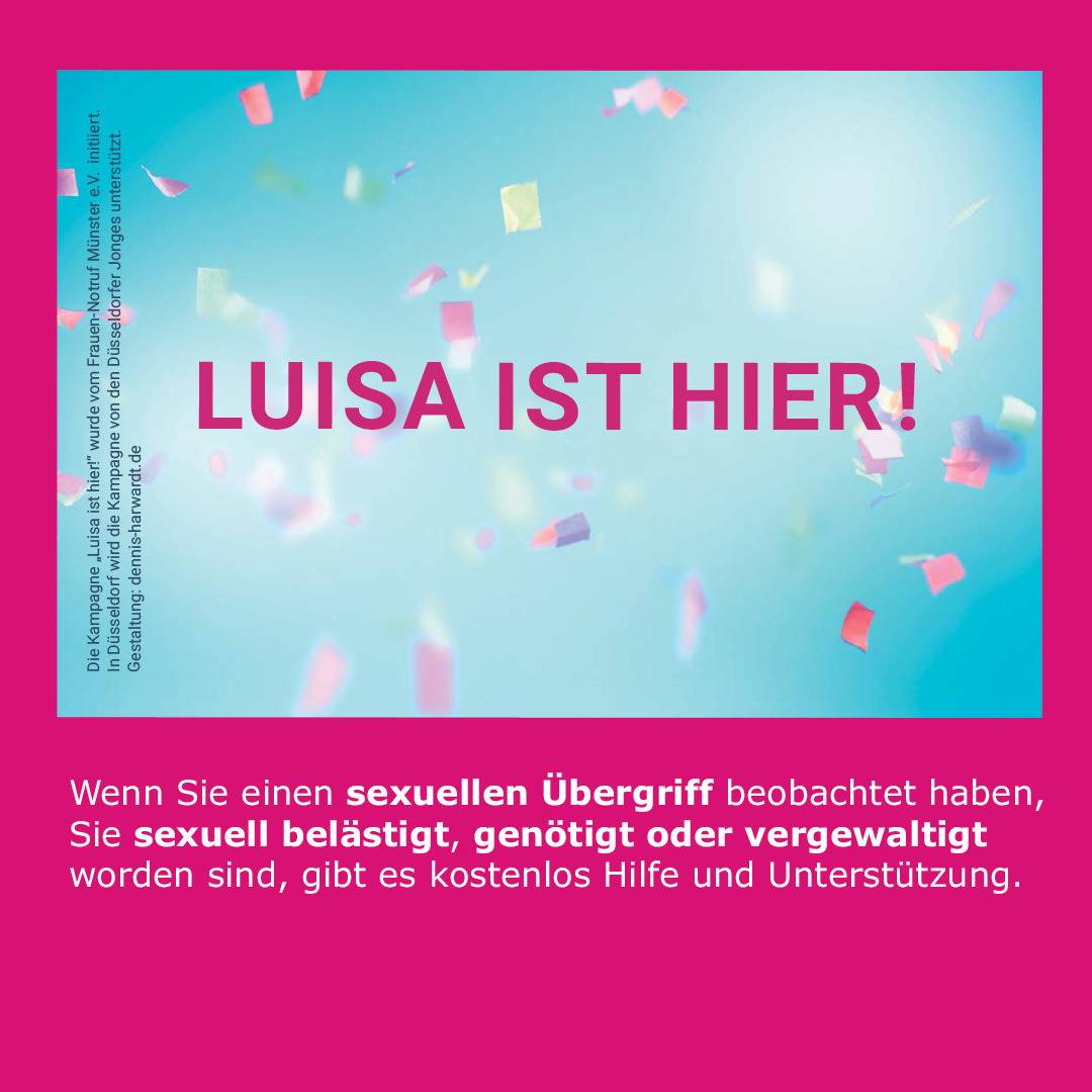 Zusätzlich gibt es die Kampagne „Luisa ist hier!“, die an über 40 Orten in Düsseldorf schnelle und unkomplizierte Hilfe bietet. Frauen können mit der Frage „Ist Luisa hier?“ das Personal in Kneipen sowie den Ordnungs- und Servicedienst oder Rettungskräfte ansprechen, um Unterstützung zu bekommen.