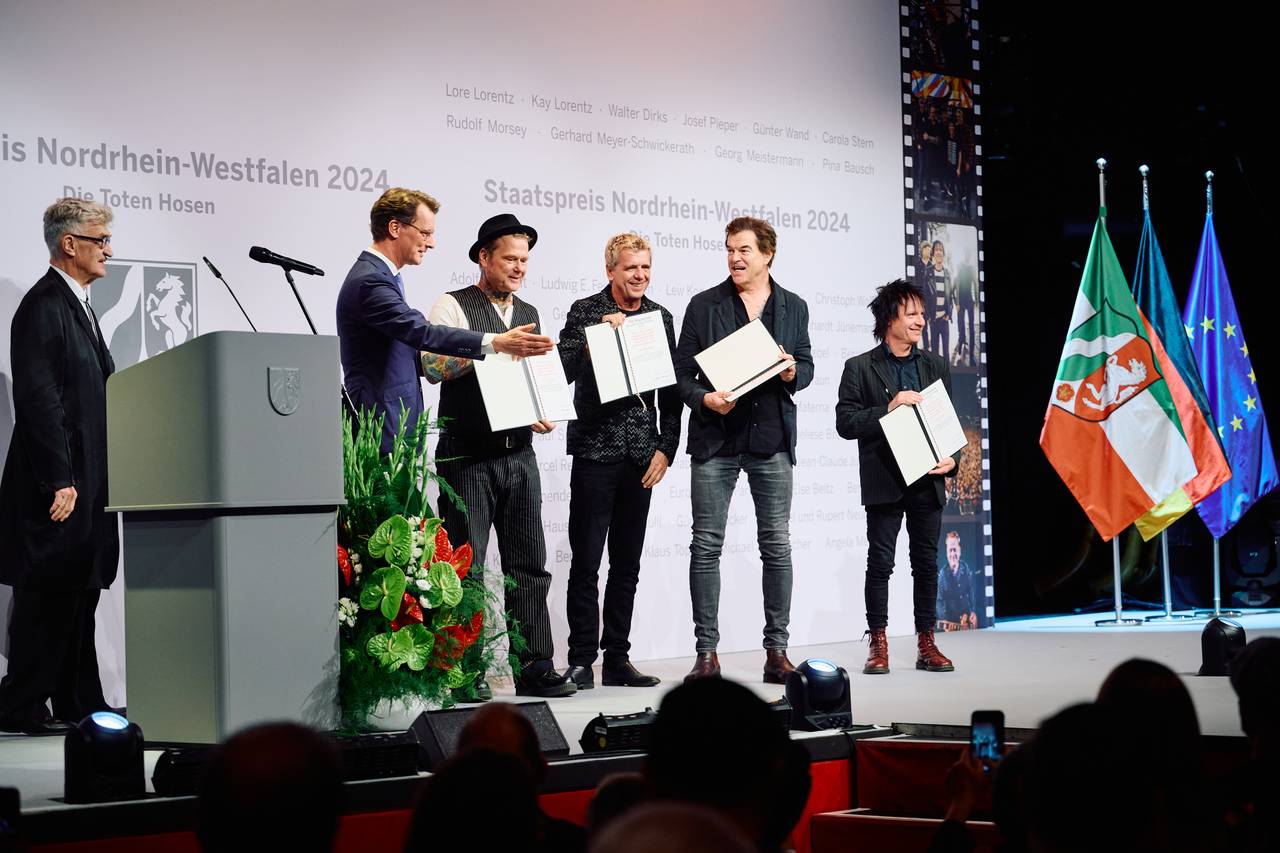 Am 30. Oktober war Wim Wenders als Laudator im Einsatz. Er hat hier in Düsseldorf damit die Toten Hosen gewürdigt, die an diesem Tag mit dem NRW-Staatspreis ausgezeichnet wurden. Geehrt wurden sie für ihren Einfluss auf den «gesellschaftlichen Diskurs und die kulturelle Landschaft in Nordrhein-Westfalen und für ihr jahrzehntelanges soziales und gesellschaftliches Engagement», so steht es in der Begründung der Staatskanzlei. Die Toten Hosen treten damit in prominente Fußstapfen, denn im vergangenen Jahr bekam Altkanzlerin Angela Merkel den NRW-Staatspreis. Außerdem wurden auch schon der Künstler Gerhard Richter, Rennfahrer Michael Schumacher und Schriftsteller Marcel Reich-Ranicki mit dieser Auszeichnung geehrt. Wim Wenders verbindet seit Jahren eine gute Freundschaft mit den Toten Hosen. 2021 hielt Campino zum Beispiel die Laudatio, als Wenders als «Düsseldorfer des Jahres» ausgezeichnet wurde.