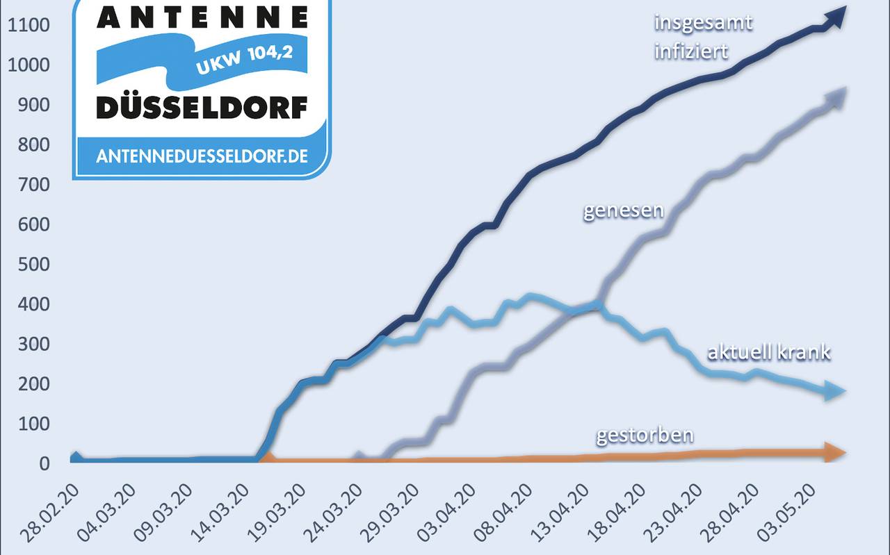 Damit ihr einen besseren Überblick habt wie sich die Corona-Zahlen in Düsseldorf entwickeln, haben wir euch ein Kurvendiagramm erstellt. Es zeigt die Entwicklung im Hinblick auf die Zahl der Infizierten in Düsseldorf insgesamt, der aktuell Erkrankten, der Genesenen und derjenigen, die die Folgen des Coronavirus nicht überlebt haben (Stand 7. Mai 2020).
