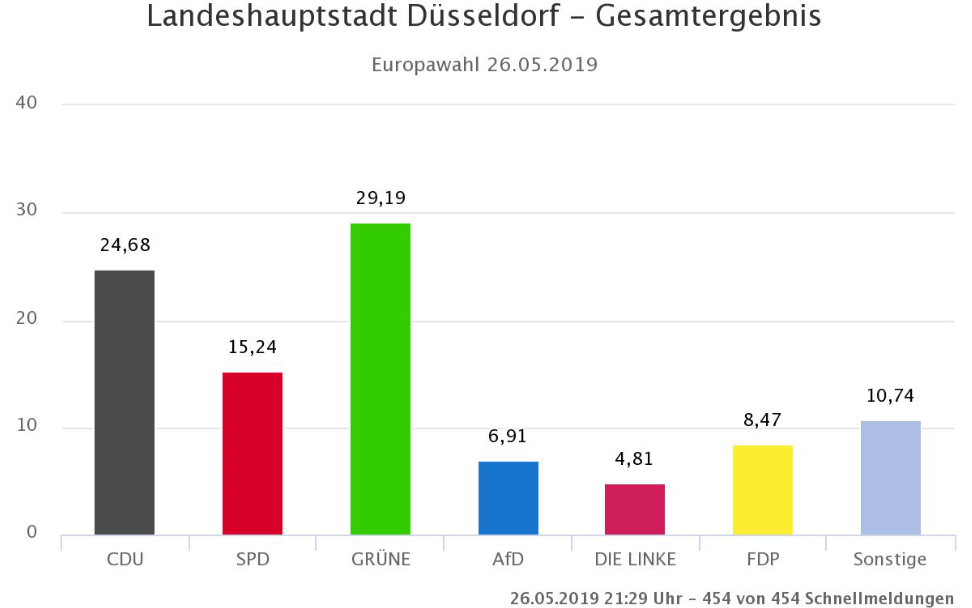Über 76.000 Düsseldorfer haben „grün“ gewählt. Das sind gut 29%. Damit liegt die Partei klar vor der CDU, die auf knapp 25% der Stimmen kommt. Die schwersten Verluste gibt es aber auch in Düsseldorf für die SPD. Sie halbiert sich hier auf 15%. Die FDP steigert sich auf rund 8,5%. Die LINKE rutscht knapp unter 5%. Die AfD erreicht bei der Europawahl in Düsseldorf knapp 7%.