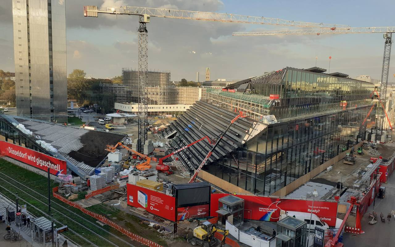 Am Gustav-Gründgens-Platz ist das begehbare Dach des kleineren Gebäudes inzwischen begrünt. Auf das größere Dach werden in den kommenden zwei Monaten Buchenhecken gesetzt. Parallel starten heute (6. Januar 2020) Leitungsarbeiten, damit die Schadowstraße ab dem Frühjahr umgestaltet werden kann.