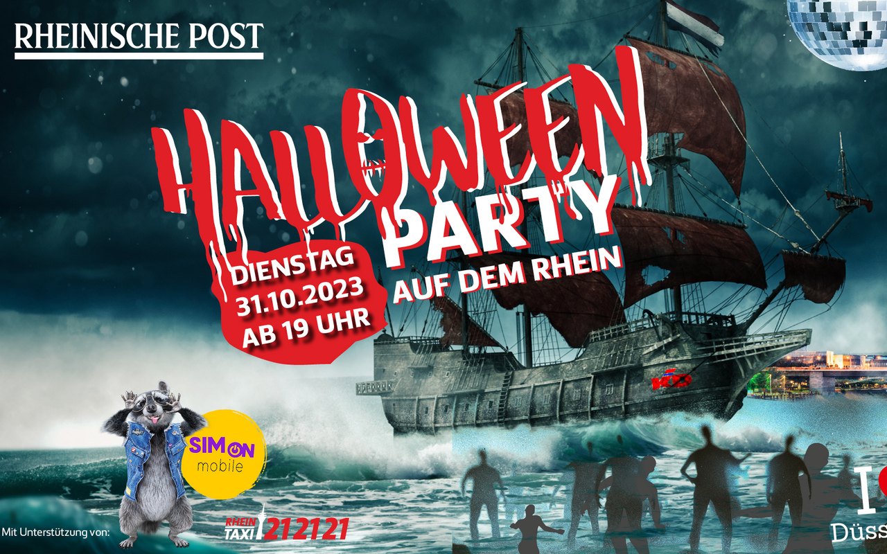 Die große Halloweenparty auf dem Rhein wird von der Rheinischen Post veranstaltet und lädt zum Gruseln ein. Bei der dreistündigen Schifffahrt sorgt der DJ Jan Plonka für den passenden Gruselsound zum Tanzen. Er spielt Charts und die bekannten Party-Klassiker. Mit "Süßes und Sauers" und passender Deko wird für die passende Stimmung gesorgt. Das Schiff legt um 21 Uhr ab und ist pünktlich zur Geisterstunde wieder in Düsseldorf. Gefeiert wird aber noch bis zwei. Der Dresscode ist: Halloween-Outfit mit einer Narbe oder etwas Kunstblut. Wer sich gar nicht verkleiden will, muss einfach nur böse gucken. Das reicht auch!