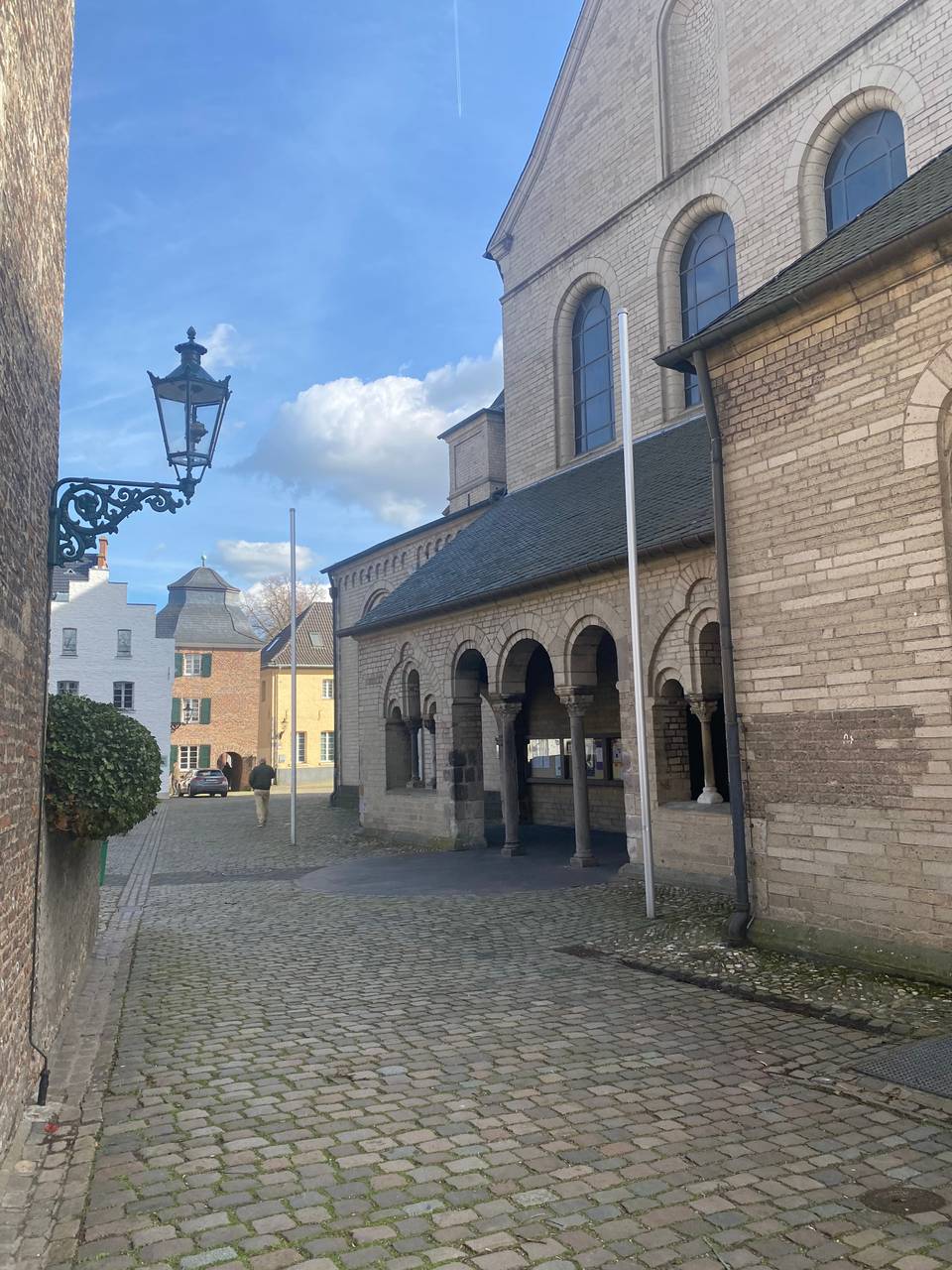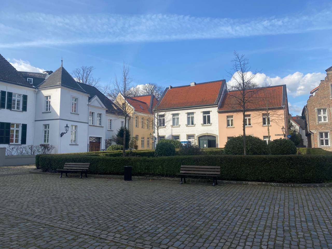 Neben der St. Suitbertus Basilika befindet sich der Stiftsplatz, mit dem historischen Kopfsteinpflaster und alten Häuserfassaden.