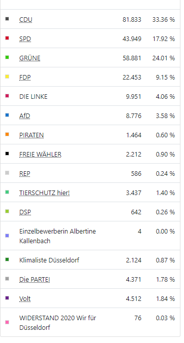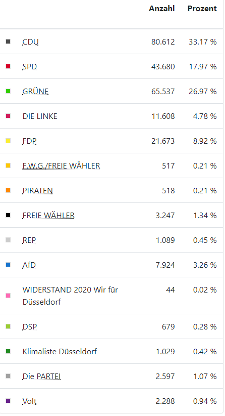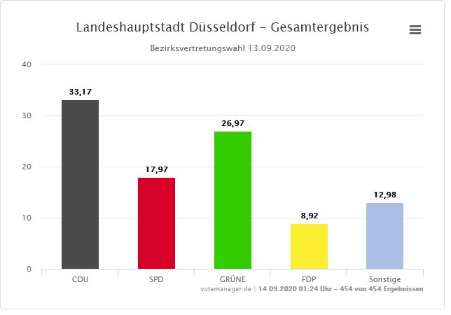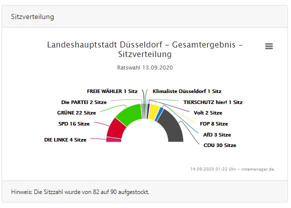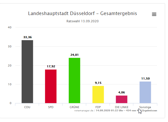 Wir Düsseldorfer haben heute aber nicht nur den OB gewählt, sondern auch über die Zusammensetzung des Rates abgestimmt. Die CDU ist dabei mit 33,36 % stärkste Kraft geworden. Die Grünen (24,01 %) haben die SPD ( 17,92 %) als zweitstärkste Kraft im Stadtrat abgelöst. Für die FDP gab es 9,15 % der Stimmen. Die Linken haben 4,06 % der Stimmen erreicht. Die Wahlbeteiligung bei der Kommunalwahl lag bei 52,57 Prozent
