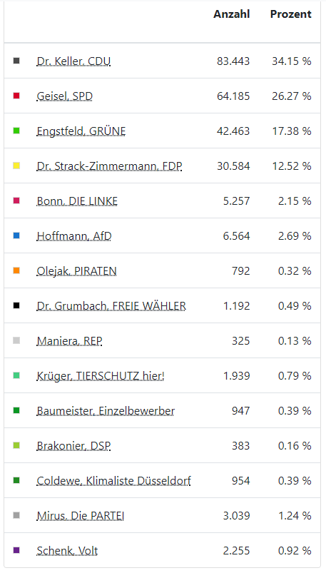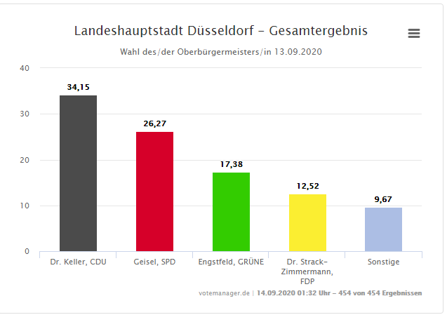 Nach diesem heutigen Wahltag in Düsseldorf am 13. September steht fest, dass wir noch nicht wissen, wer demnächst als Oberbürgermeister im Rathaus das Sagen hat. In der Stichwahl am 27. September haben wir die Wahl zwischen Amtsinhaber Thomas Geisel von der SPD und Stephan Keller von der CDU. Geisel bekam nach der Auszählung aller 454 Ergebnisse (316 Wahllokale + 138 Briefwahlbezirke) 26,27 % der Stimmen. Für Keller haben sich 34,15 % entschieden.