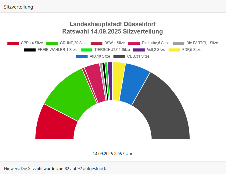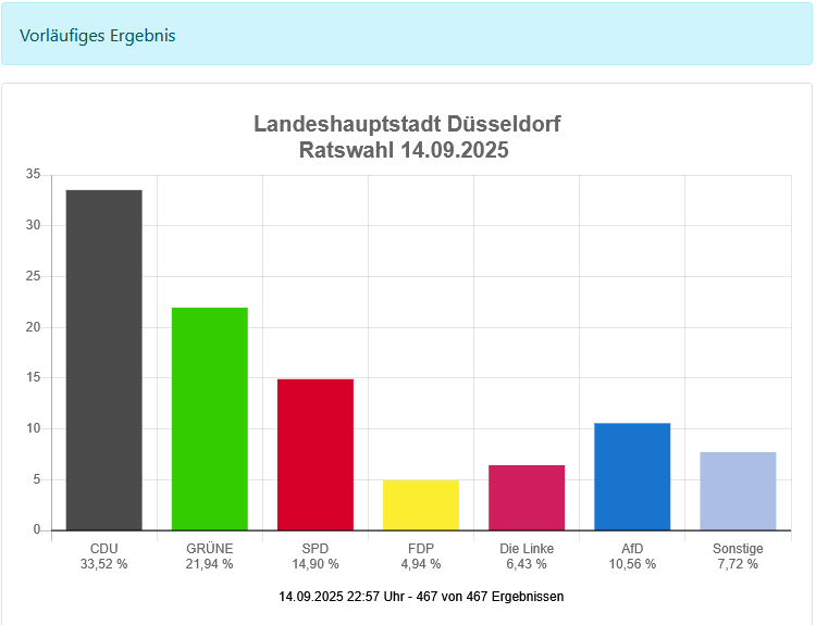 Die CDU bleibt im Düsseldorfer Stadtrat die stärkste Fraktion. CDU: 33,52% (2020: 33,36 Prozent). BÜNDNIS 90/DIE GRÜNEN: 21,94% (2020: 24,01 Prozent). Die SPD kam auf 14,90% (2020: 17,92 Prozent). Die AfD erzielte 10,56% (2020: 3,58 Prozent). Die Linke erhielt 6,43% (2020: 4,06 Prozent). Die FDP kam auf 4,94% (2020: 9,15 Prozent).