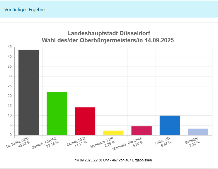 Das vorläufige Endergebnis der OB-Wahl 2025 in Düsseldorf sieht Stephan Keller (CDU) mit 43,57 % vorn. Da kein Kandidat die absolute Mehrheit erreicht hat, kommt es zur Stichwahl zwischen Keller und Clara Gerlach (Grüne).