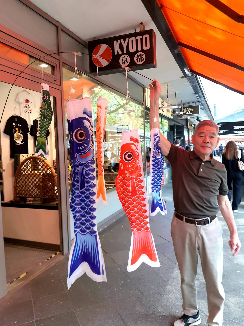 Am 05. Mai ist in Japan Kindertag. Dabei hissen die Familien auf einem Bambusstab die Kionobori - die Karpfenfahnen: eine große, schwarze für den Vater, eine rote für die Mutter, je eine bunte für jedes Kind. Die ähnlich einer Wetterfahne im Wind wehenden Karpfen sollen dabei für die Stärke des Kindes stehen, vergleichbar mit einem Karpfen der gegen den Strom schwimmen muss. Und diese Tradition kann man natürlich auch bei uns im Japanviertel sehen und erleben.