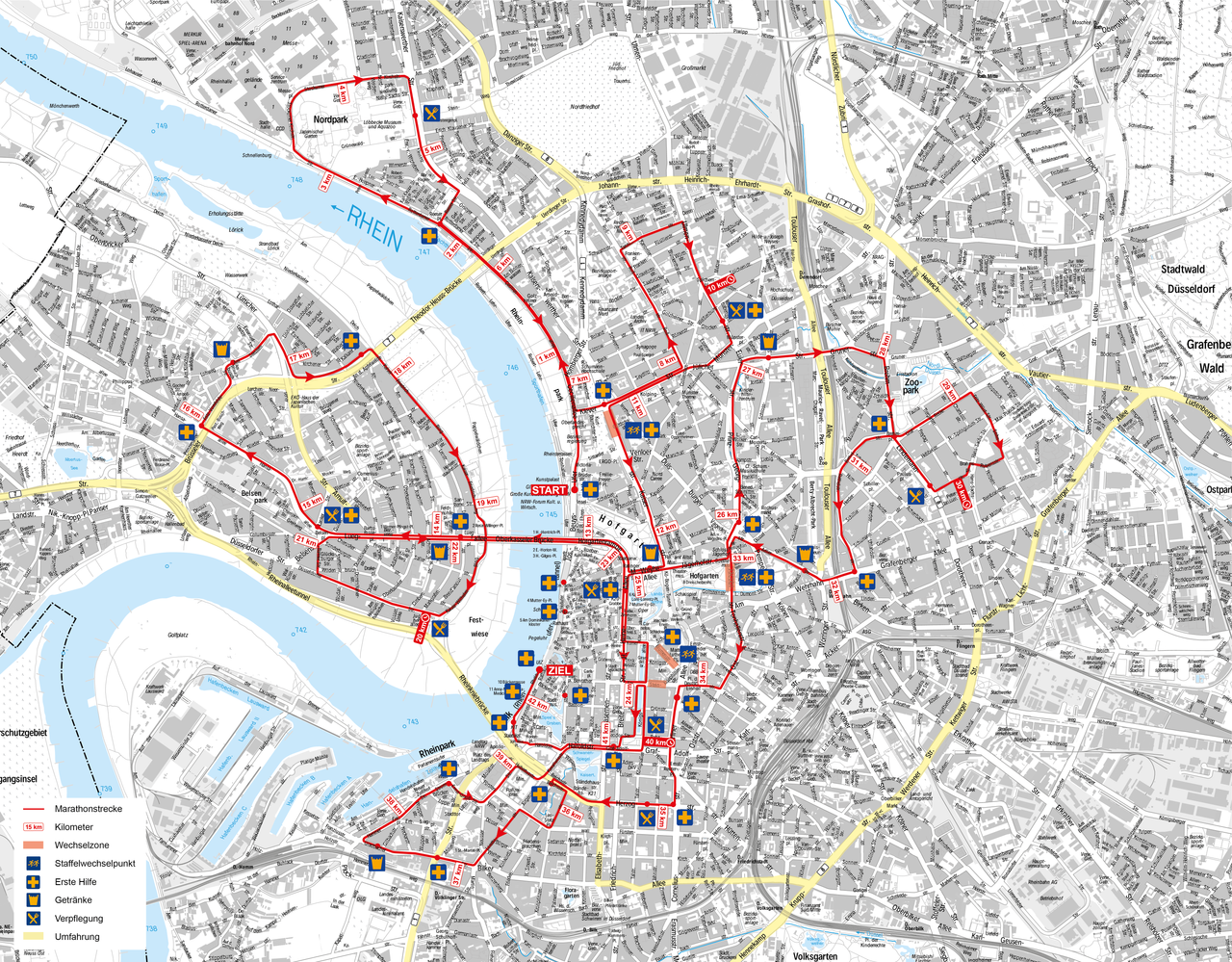 Nach dem Start am Joseph-Beuys-Ufer führt die weitestgehend flache Strecke entlang des Rheins in Richtung Messe und Nordpark, bevor nach ca. 5 km die erste Verpflegungsstelle in Höhe des Aquazoos passiert wird. Danach geht es weiter in Richtung Innenstadt, bevor kurz nach km 13 die Strecke über die Oberkasseler Brücke auf die andere Seite des Rheins führt. Nach einer Schleife durch Oberkassel und passieren der Halbmarathon Marke geht es wieder über den Rhein in Richtung Königsallee. Von dort aus führt der Streckenverlauf am Zoopark vorbei und nimmt Kurs in Richtung Medienhafen. Nach einer weitere Schleife über die Königsallee geht es auf die letzten Kilometer in Richtung Ziel am unteren Rheinwerft. Das Ziel befindet sich direkt in der Altstadt. Perfekt, um dort mit einem kühlen Altbier auf den Erfolg anzustoßen.