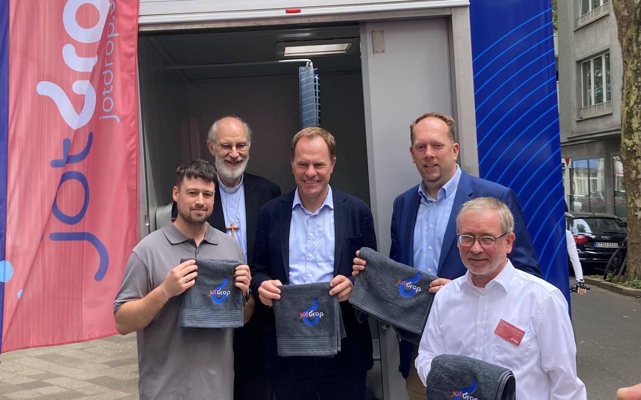 "Jotdrop" ist eine mobile Dusch- und Waschstation, die der soziale Verein "Flingern mobil" ab sofort zur Verfügung stellt. Mit einem Bus wird der Anhänger mit einer Duschkabine verschiedene Standorte in der Stadt anfahren, um Wohnungslosen einen Rückzugsort zur Pflege zu bieten. Dieses Projekt wird mit 700.000 Euro von der Sozialstiftung NRW gefördert. Gut investiertes Geld, findet der Vorsitzende Marco Schmitz :