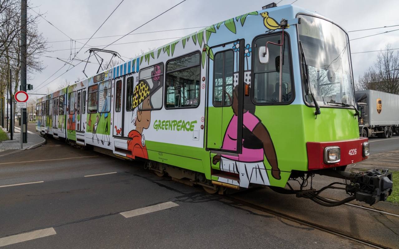 Wenn mehr Menschen mit Bussen und Bahnen statt mit dem Auto unterwegs sind, dann ist das einerseits gut fürs Klima. Andererseits bekommen die Menschen auch wieder mehr Raum und das mache Düsseldorf zu einer lebenswerten Stadt, heißt es. Die Stadtbahn fährt als rollende Litfaßsäule mit bunten Motiven und dem Greenpeace-Logo durch Düsseldorf.