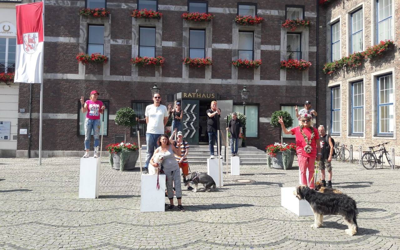 Düsseldorfer Obdachlose haben einige Menschen in der Stadt heute zum Staunen gebracht. Sie hatten sich vor dem Rathaus wie lebendige Kunstwerke auf Sockeln präsentiert.