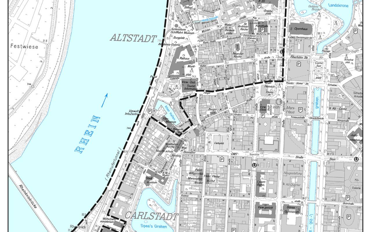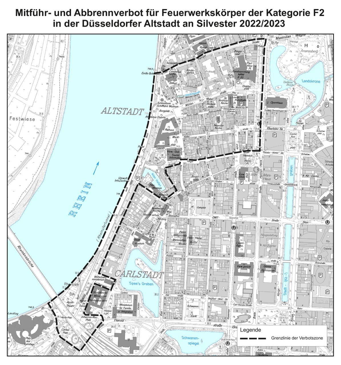 Das Verbot umfasst ein Gebiet von der Ratinger Straße im Norden, der Heinrich-Heine-Allee im Osten, der Flinger Straße und dem Gebiet um den Apolloplatz/Rheinkniebrücke im Süden und dem Rhein im Westen. Wie im Vorjahr wird die Zone um den Apolloplatz/Rheinkniebrücke ausgeweitet. Schilder weisen auf das Verbot hin; Kontrollstellen soll es nicht geben. Verbotswidrig mitgebrachte Feuerwerkskörper dürfen durch die Polizei und das Ordnungsamt sichergestellt werden. Die sichergestellten Feuerwerkskörper werden unmittelbar vor Ort vernichtet. Dazu werden an verschiedenen Stellen mit Wasser gefüllte Container aufgestellt, in denen Feuerwerkskörper unbrauchbar gemacht und zwischengelagert werden können. Die Polizei wird mit einem erheblichen Personalaufgebot im gesamten Gebiet der Altstadt, besonders an neuralgischen Punkten, präsent sein. Auch das Ordnungsamt wird zum Jahreswechsel mit erhöhtem Personalaufwand im Einsatz sein. Sie setzen sich zusammen aus Mitarbeitern der städtischen Verkehrsüberwachung und des Ordnungs- und Servicedienstes. Die Streifen des Ordnungsamtes kümmern sich neben der Einhaltung des Böllerverbots um die Einhaltung der Düsseldorfer Straßenordnung, der Sondernutzungssatzung, des Immissionsschutzgesetzes, des Jugendschutzgesetzes sowie um den Taxihalteplatz an der Heinrich-Heine-Allee.