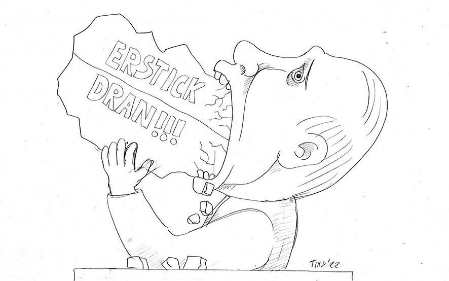 Die Düsseldorfer Diakonie versteigert eine Skizze von Jacques Tillys Putin-Wagen. Der Wagen zeigt Putin, wie er versucht die Ukraine zu verschlingen, mit dem Spruch: "Erstick dran".