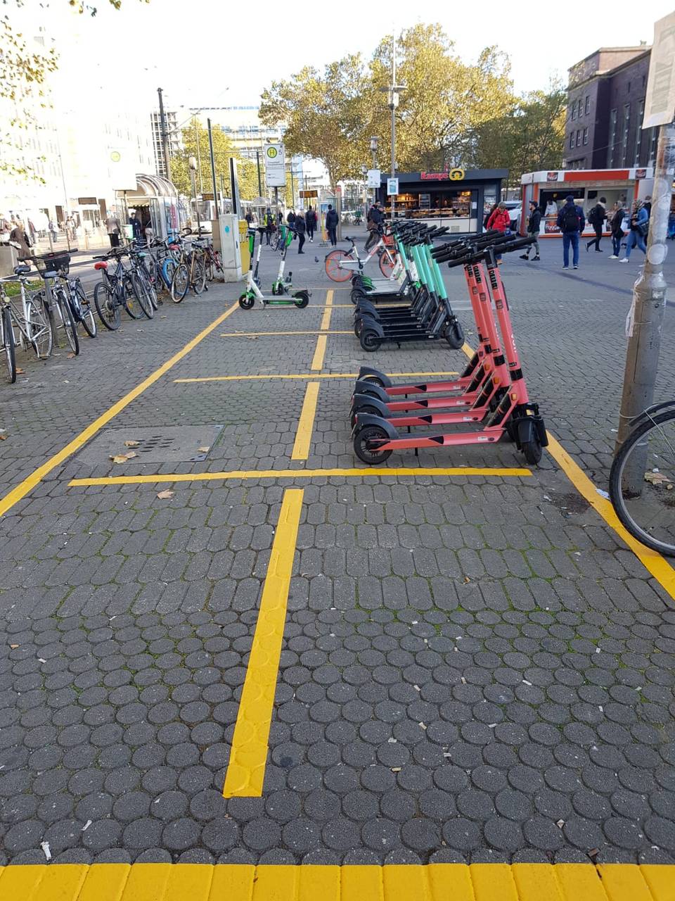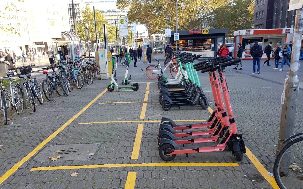 Vor dem Düsseldorfer Hauptbahnhof gibt es schon neue Regeln für E-Scooter: seit Anfang der Woche gibt es eine feste Parkfläche vor dem Haupteingang am Konrad-Adenauer-Platz. Die Deutsche Bahn hat die Flächen farbig markiert. Bis zu 40 E-Scooter können hier abgestellt werden. Der Düsseldorfer Hauptbahnhof ist der erste Bahnhof in NRW mit einer festen Parkfläche für E-Scooter.