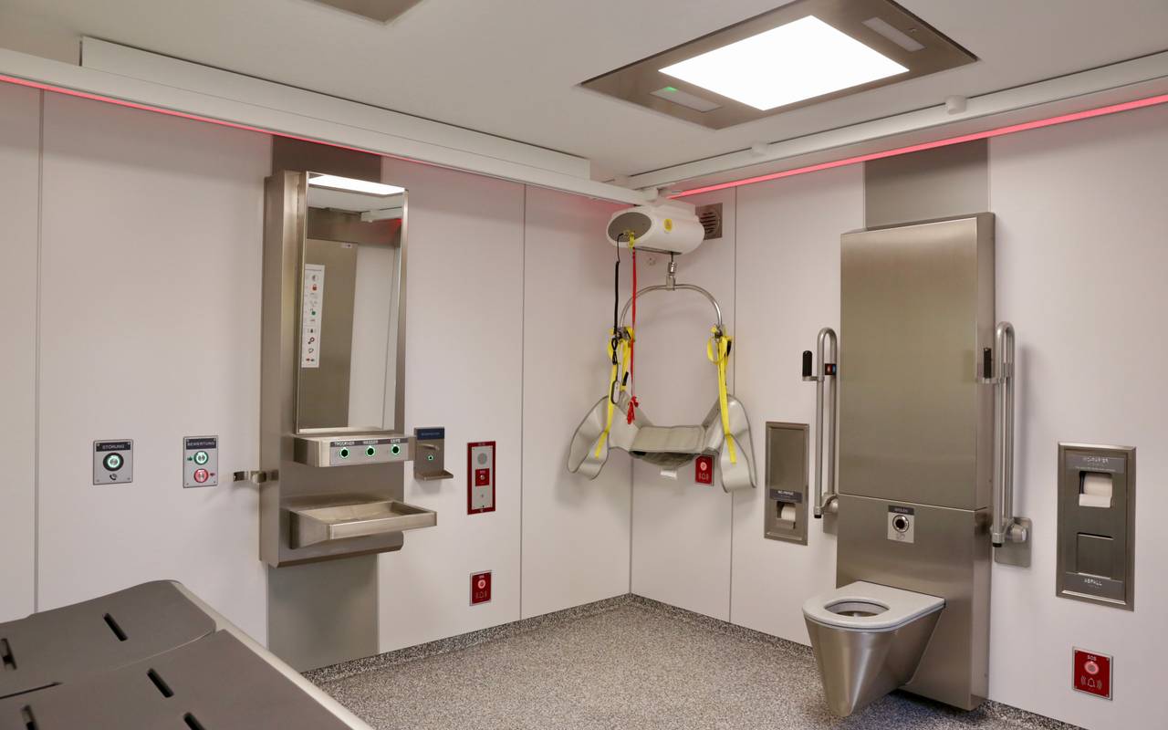 Damit Menschen, die starke körperliche Behinderungen haben, fürs Auf-Toilette-Gehen nicht nach Hause fahren müssen, sondern in der Stadt bleiben können, gibt es in Düsseldorf eine neue Toilette. Die "Toilette für Alle" steht an der Kniebrücke. Sie ist barrierefrei, aber das Besondere ist, dass es hier zum Beispiel eine Liege, einen Lifter und ein Notrufsystem gibt.