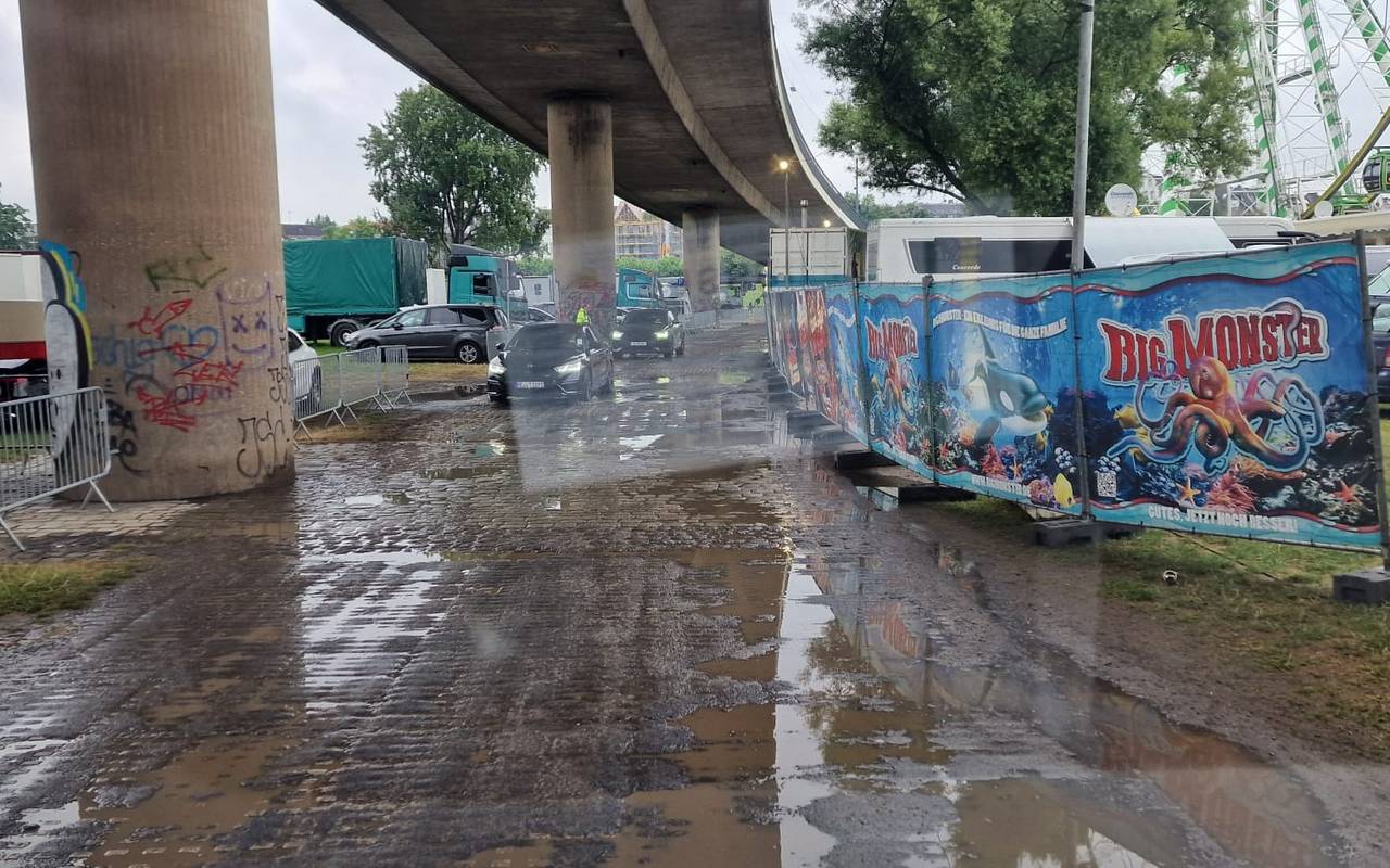 Obwohl die meisten Wege für die Besucher trocken sind, macht das Wetter den Organisatoren Sorgen. Der Parkplatz für die Autos, Wohnwagen und LKW ist eine Seenlandschaft, ähnlich sehen auch manche Rettungswege aus. Auch der Biergarten der Schützen steht teilweise unter Wasser, Stehtische und Sitzbänke stehen im Morast. Um 16.30 Uhr will Oberbürgermeister Keller die Kirmes offiziell eröffnen und hunderte rot-weiße Luftballons aufsteigen lassen. Dann laut Regenradar vermutlich bei trockenem Wetter.
